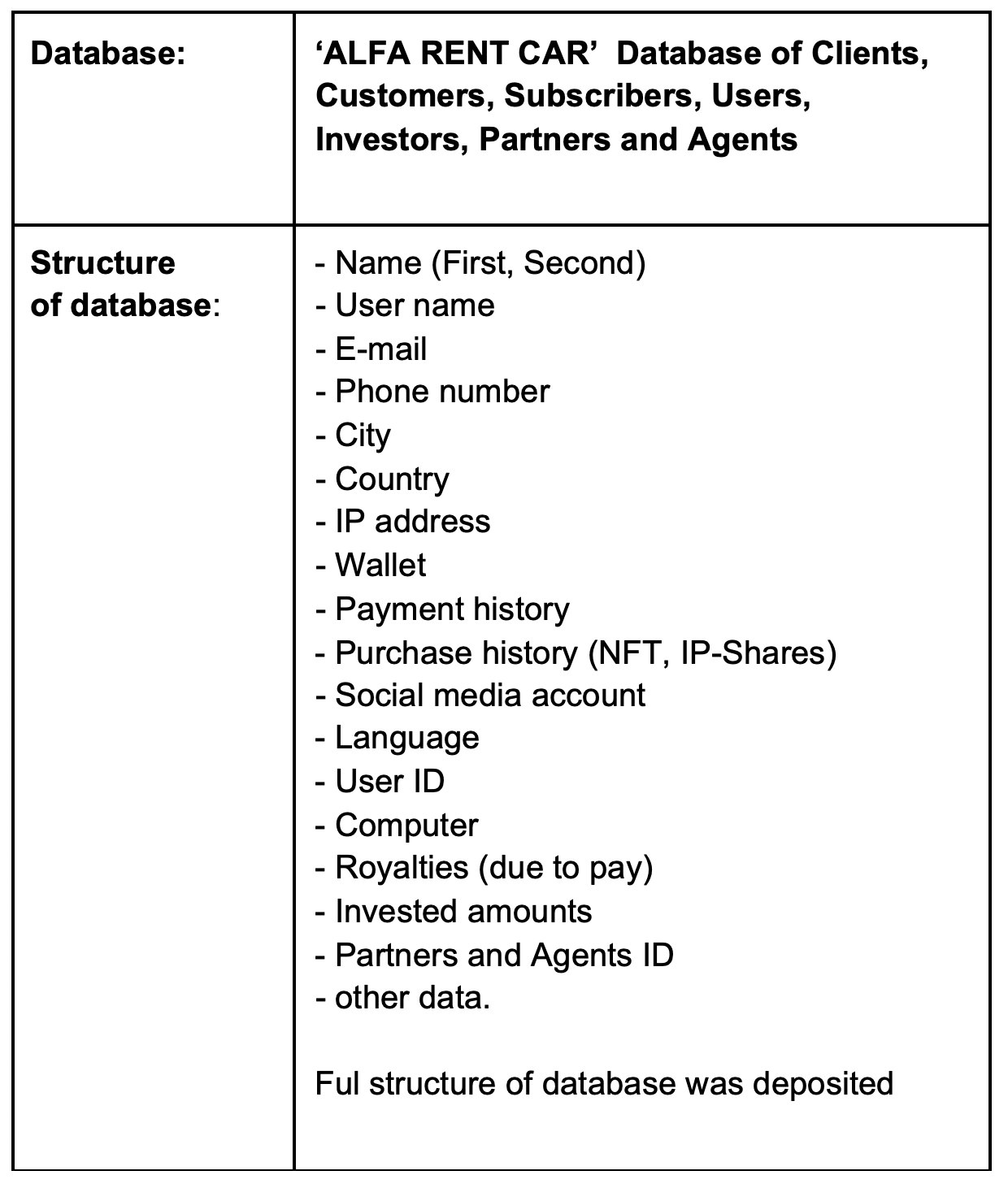 Database: ‘ALFA RENT CAR' Database of Clients, Customers, Subscribers, Users, Investors, Partners and Agents