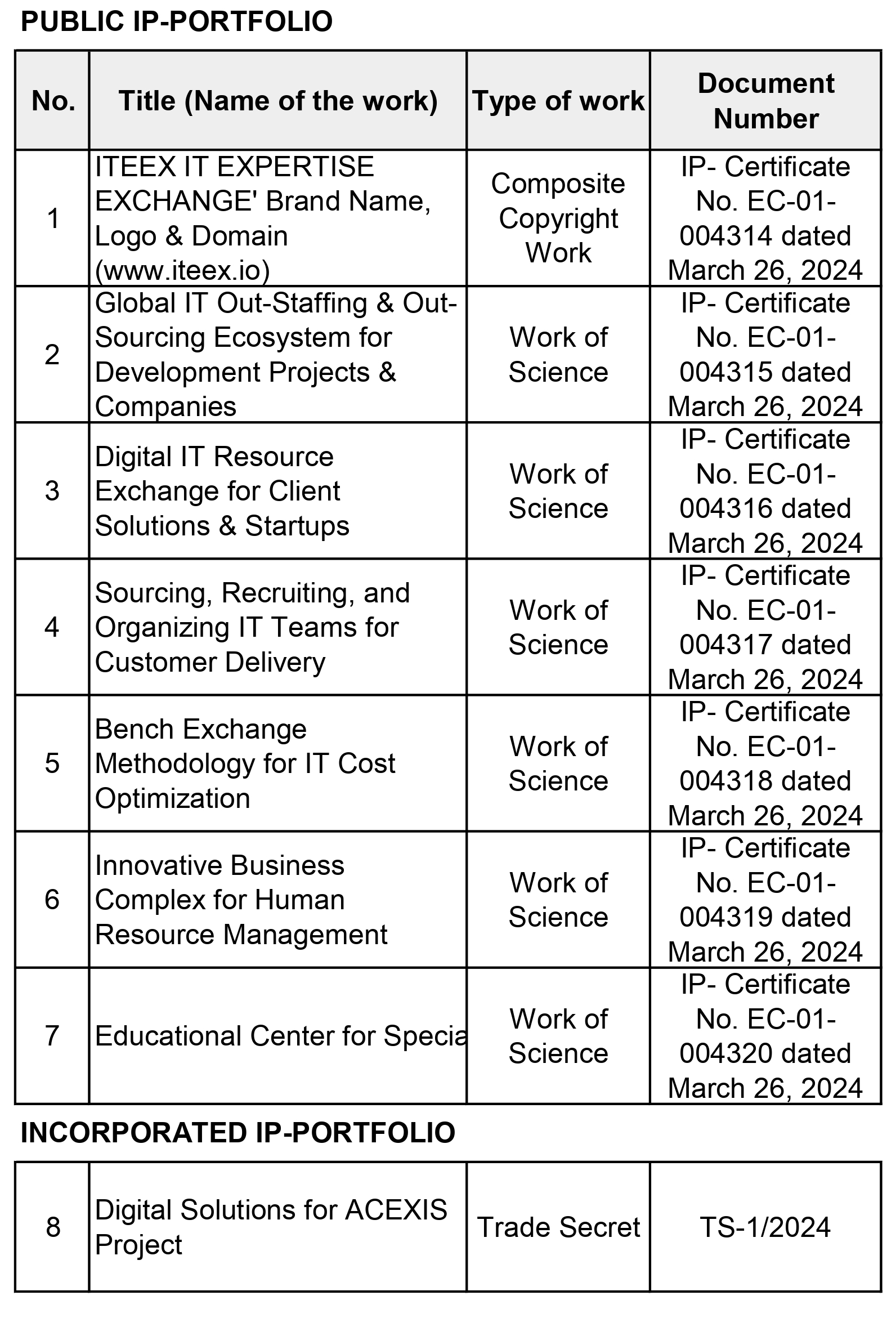 Consolidated Composite Copyright Work: "ITEEX IT EXPERTISE EXCHANGE" Business Technologies and Intellectual Assets
