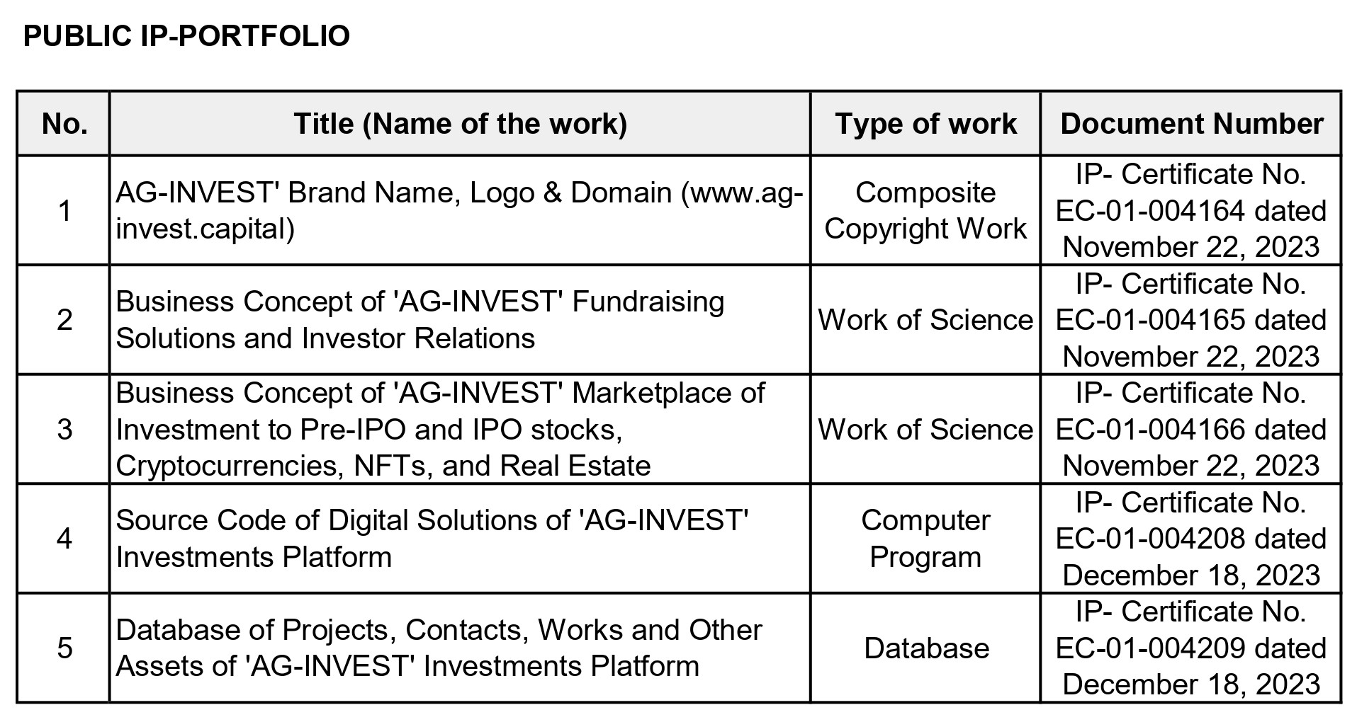 Consolidated Composite Copyright Work: 'AG-INVEST' Business Technologies and Intellectual Assets