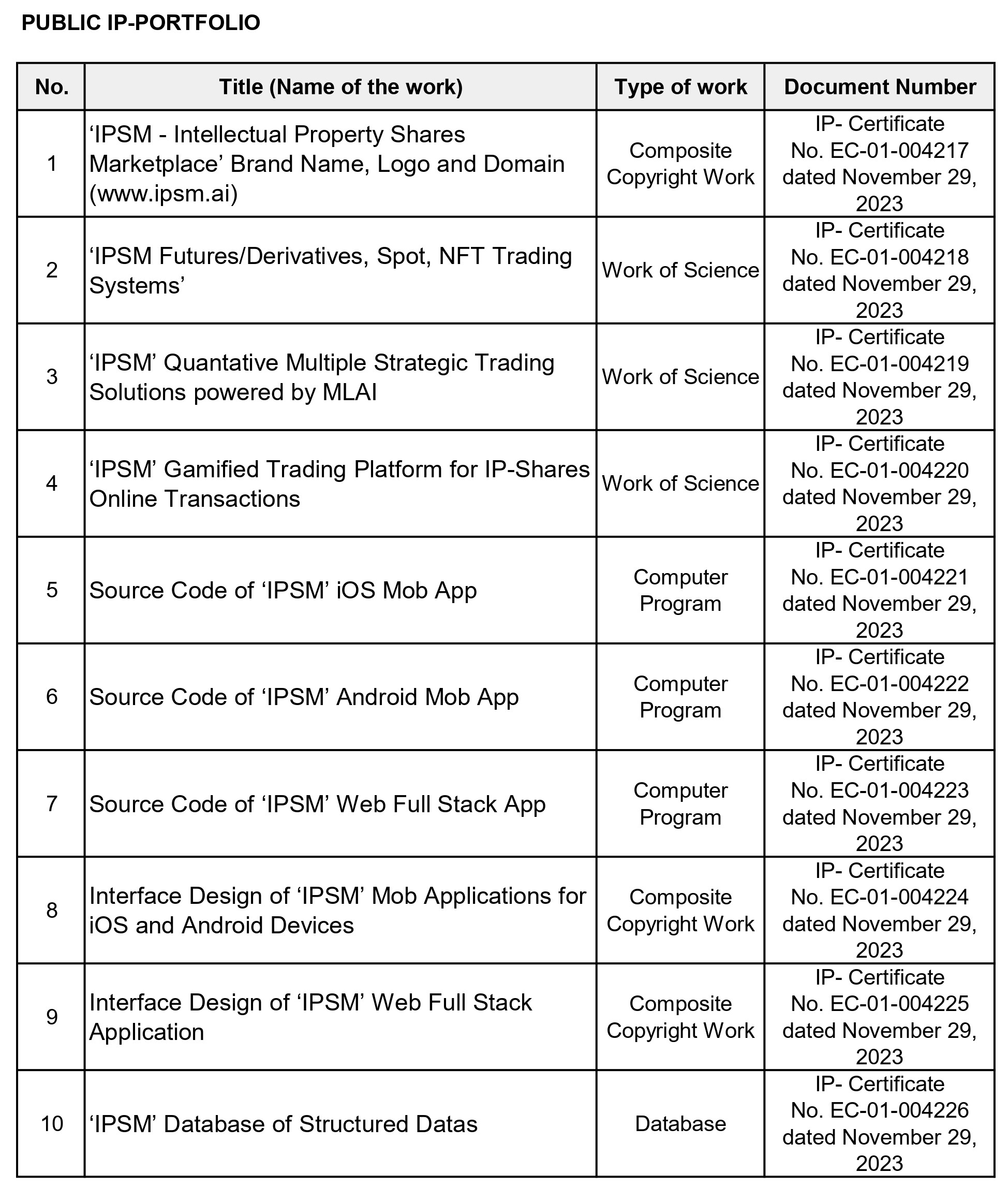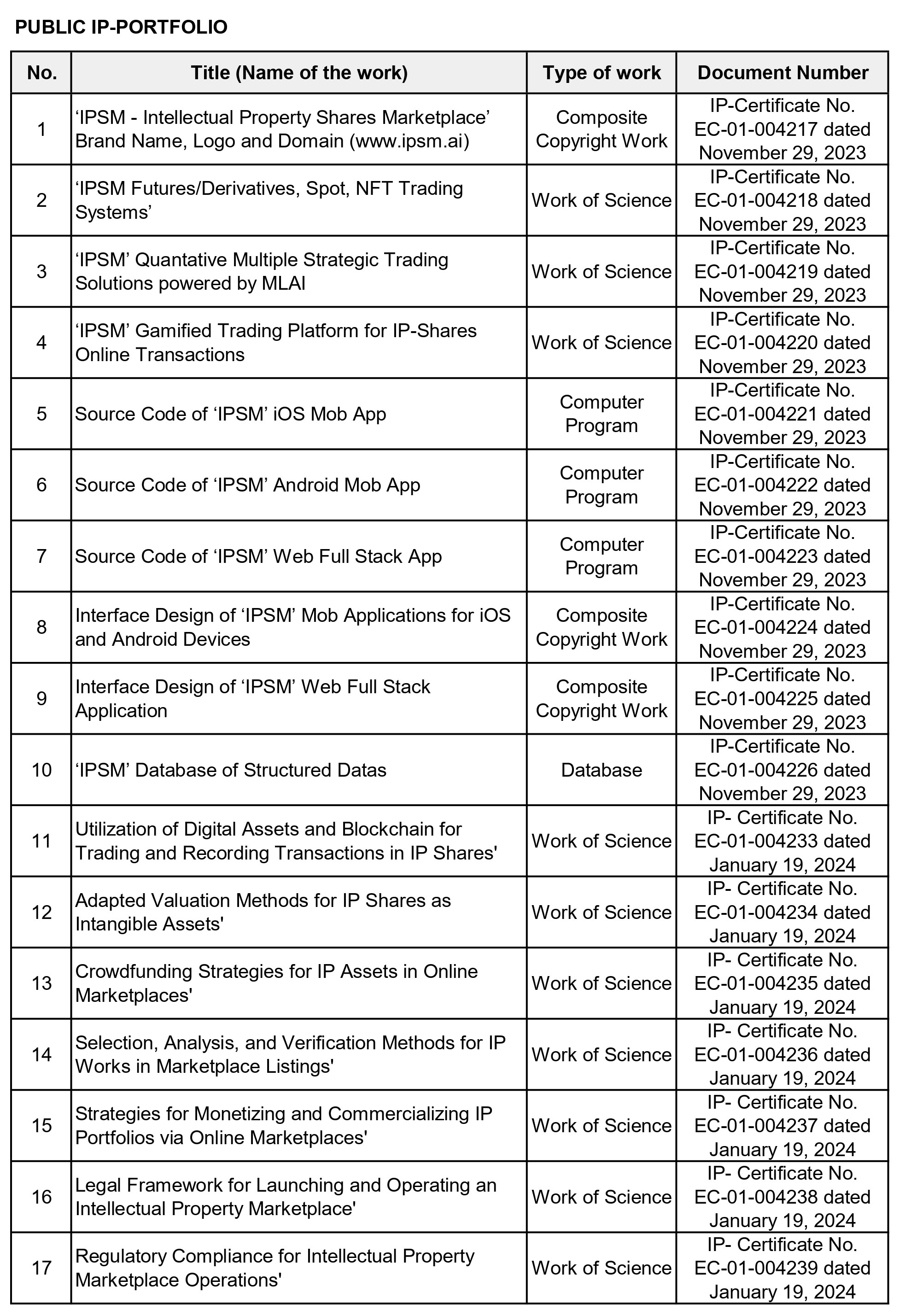 Consolidated Composite Copyright Work: 'Global Package of IP-Works, Rights and Exclusive License of IPSM Marketplace'