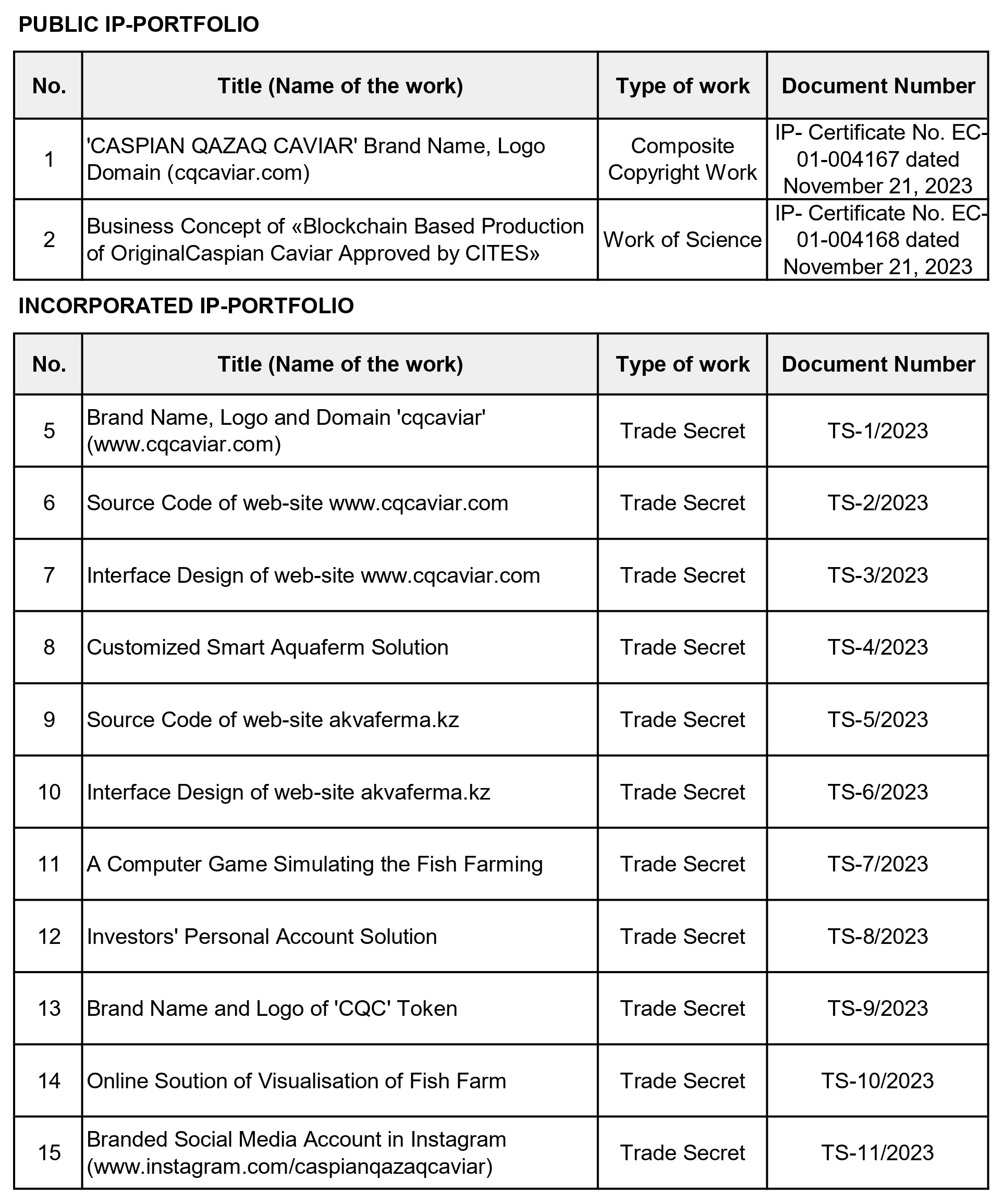 Consolidated Composite Copyright Work: 'CASPIAN QAZAQ CAVIAR' Business Technologies and Intellectual Assets