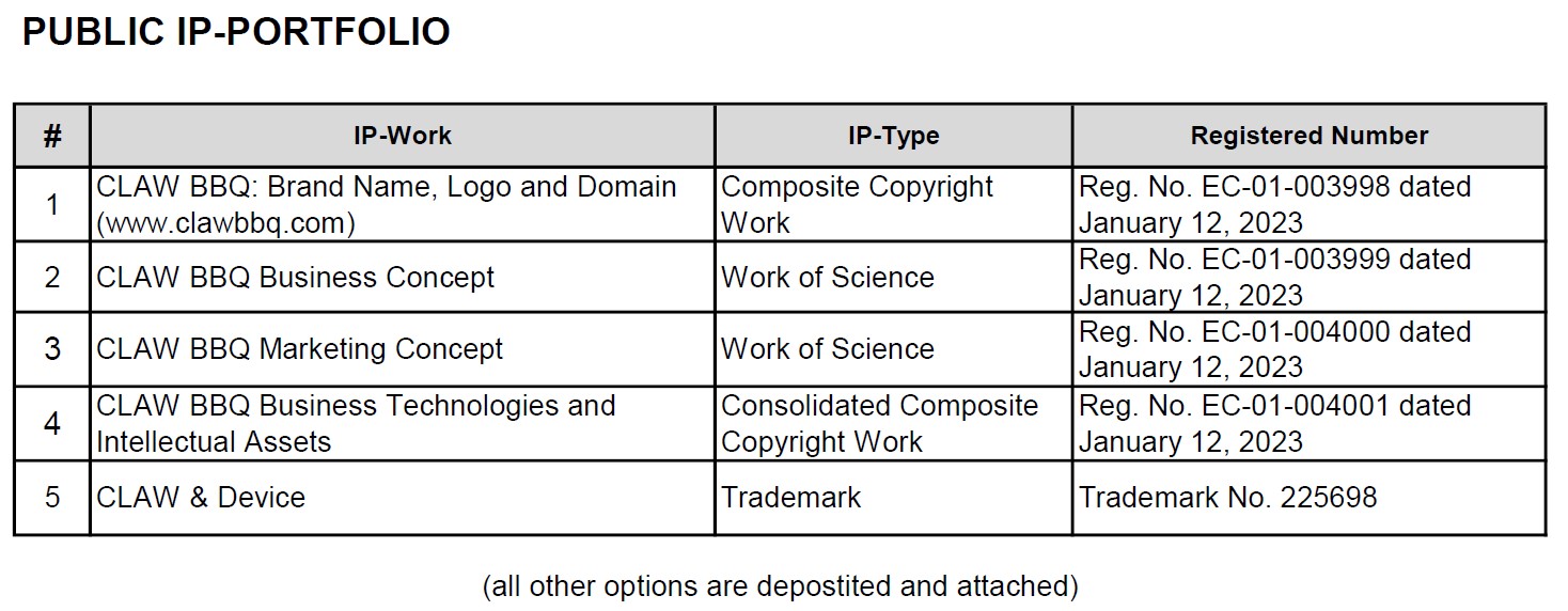 Consolidated Composite Copyright Work: CLAW BBQ Business Technologies and Intellectual Assets