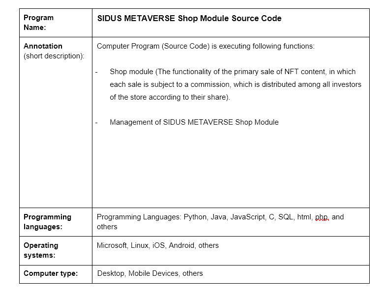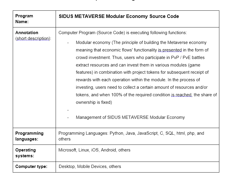 Computer Program: SIDUS METAVERSE Modular Economy Source Code