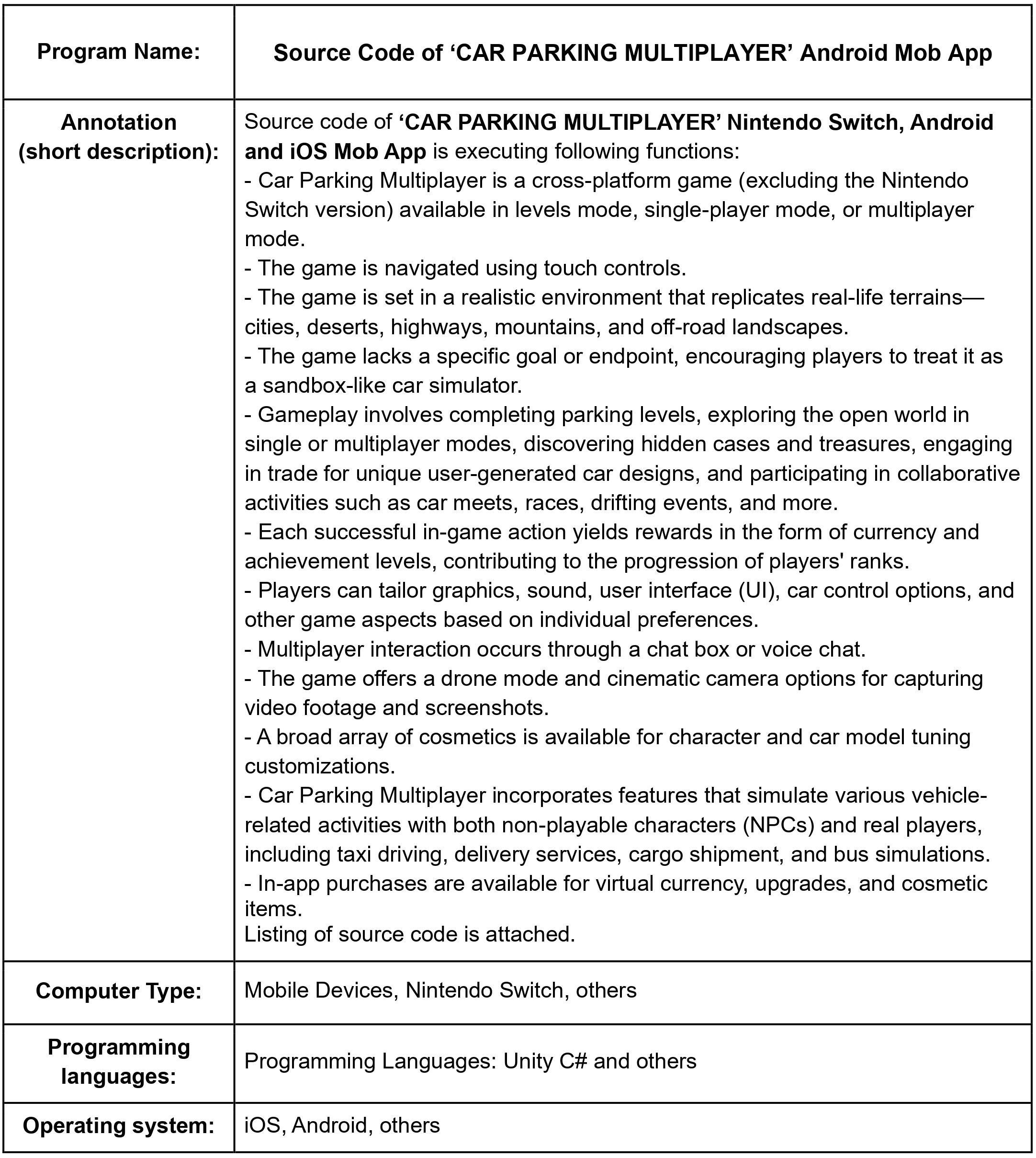 Computer Program: Source Code of 'CAR PARKING MULTIPLAYER' Nintendo Switch, Android and iOS Mob App