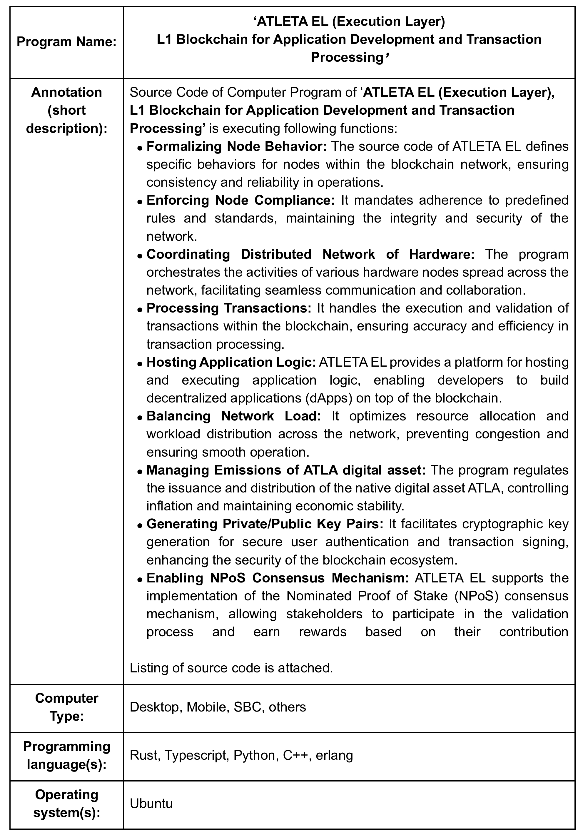 Source Code: ‘ATLETA EL (Execution Layer) L1 Blockchain for Application Development and Transaction Processing’