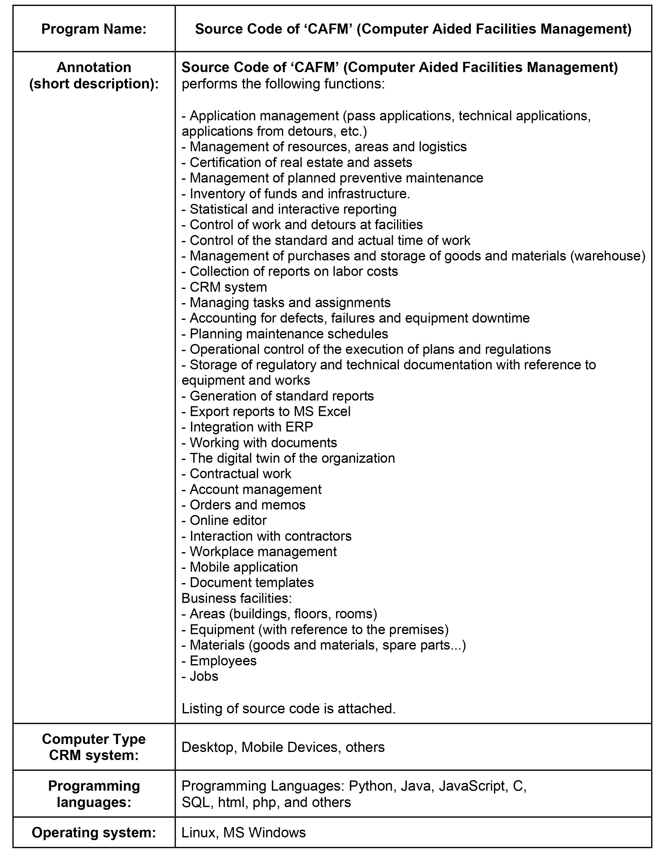 | Title of Work | Source Code of CAFM (Computer Aided Facilities Management) | ||