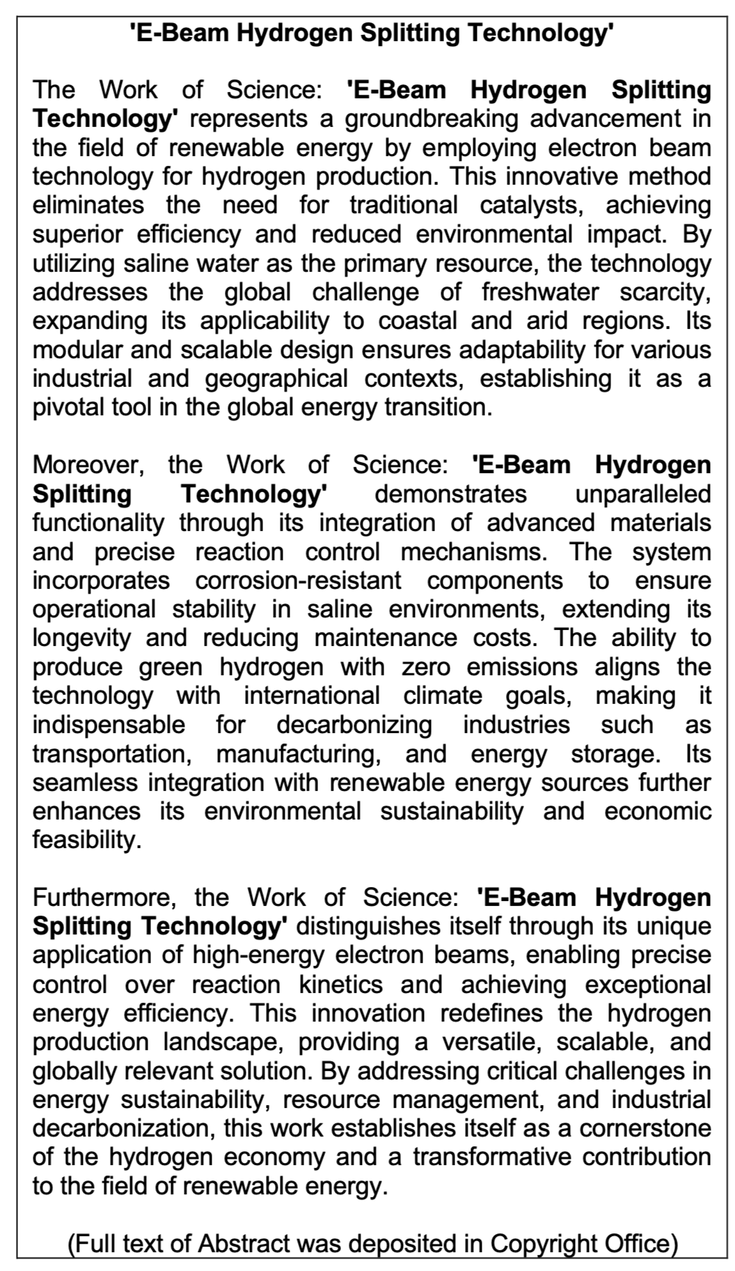 Work of Science: 'E-Beam Hydrogen Splitting Technology'