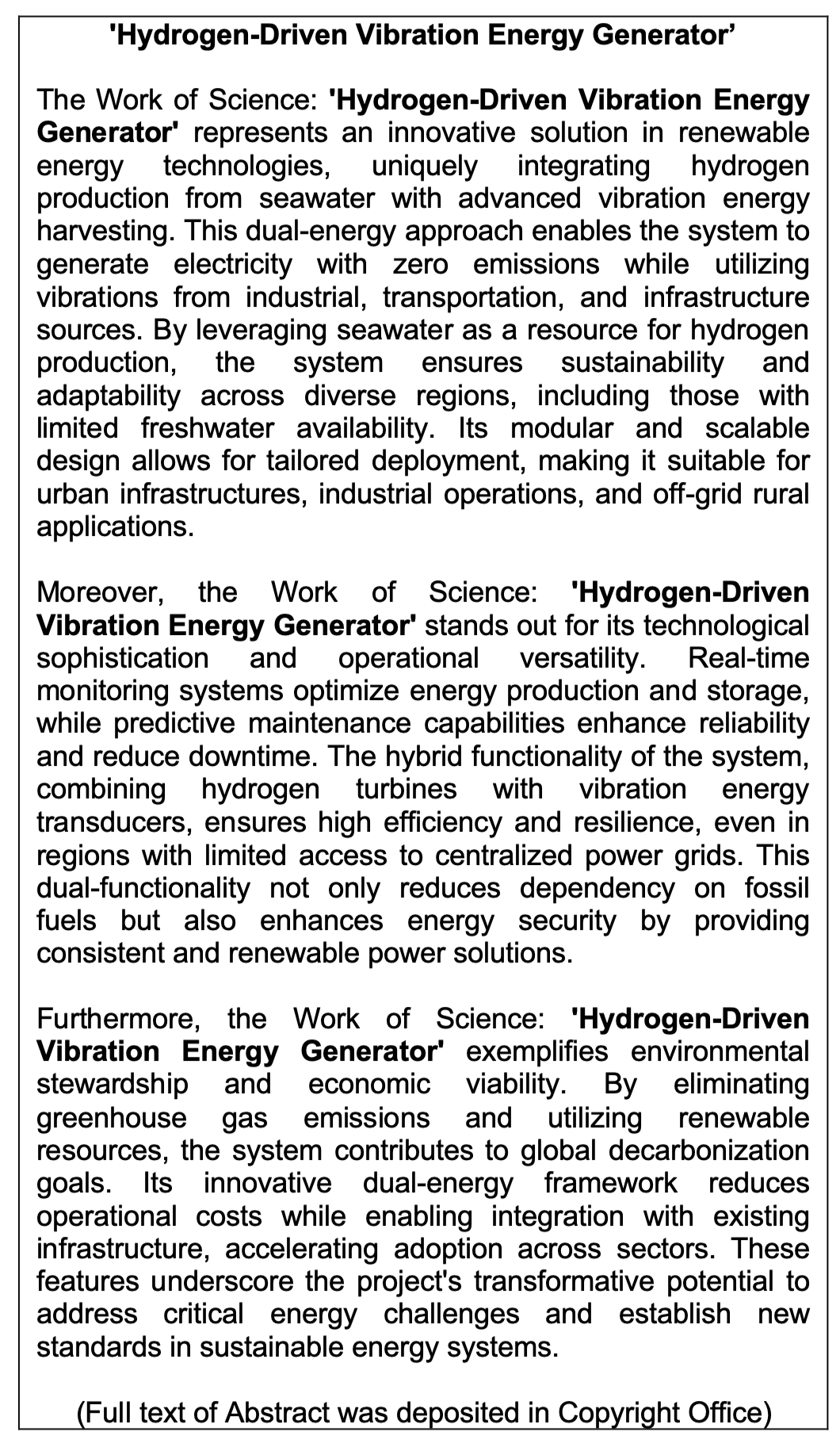 Work of Science: 'Hydrogen-Driven Vibration Energy Generator'