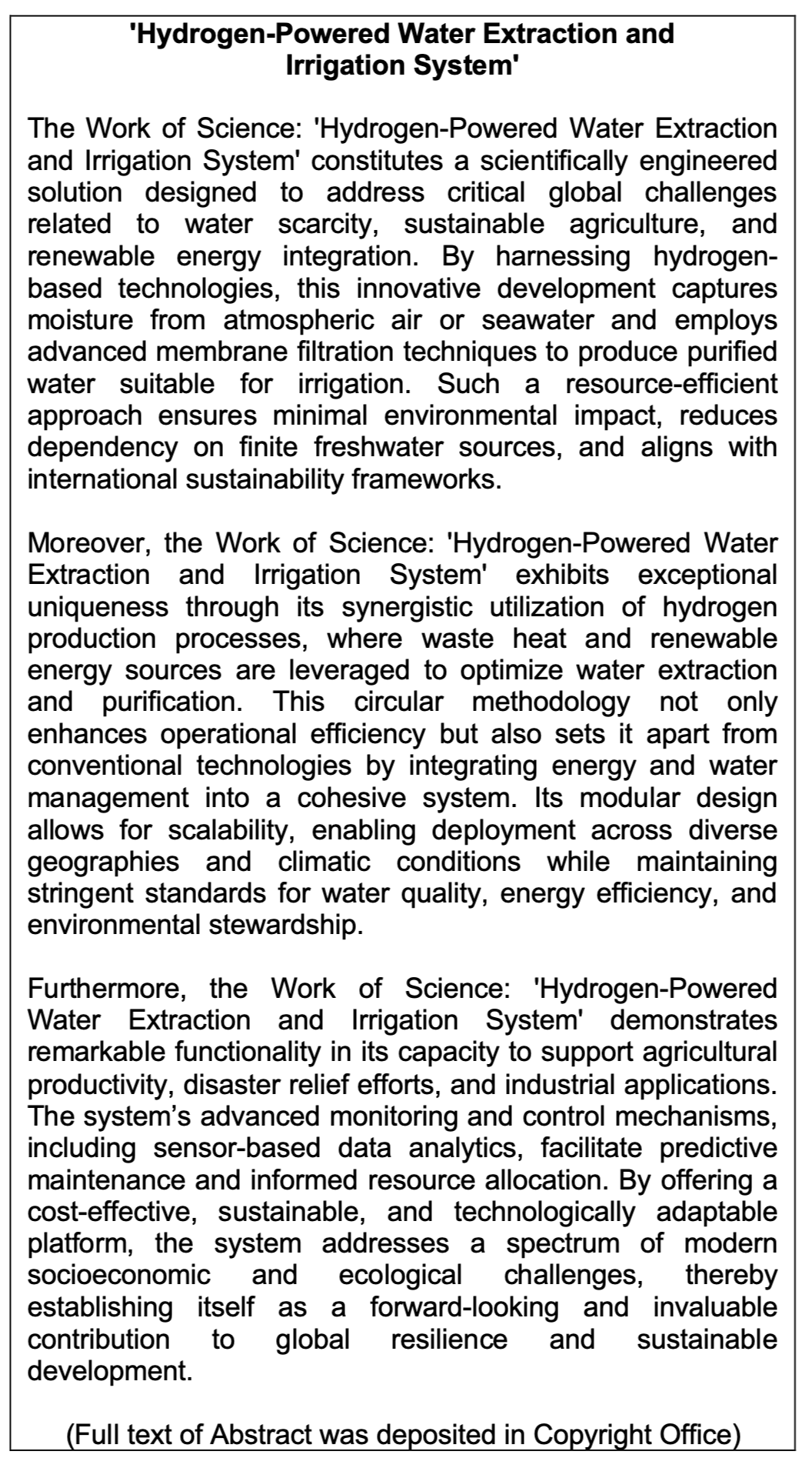 Work of Science: 'Hydrogen-Powered Water Extraction and Irrigation System'