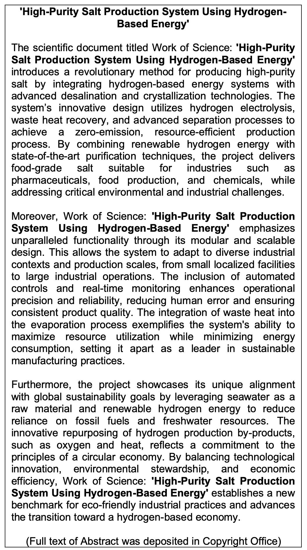 Work of Science: 'High-Purity Salt Production System Using Hydrogen-Based Energy'