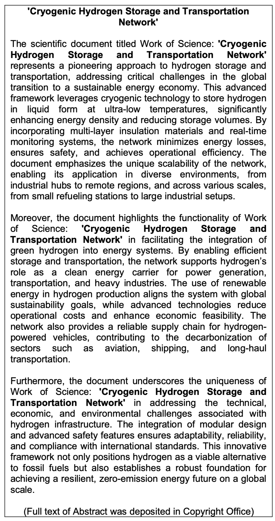 Work of Science: 'Cryogenic Hydrogen Storage and Transportation Network'