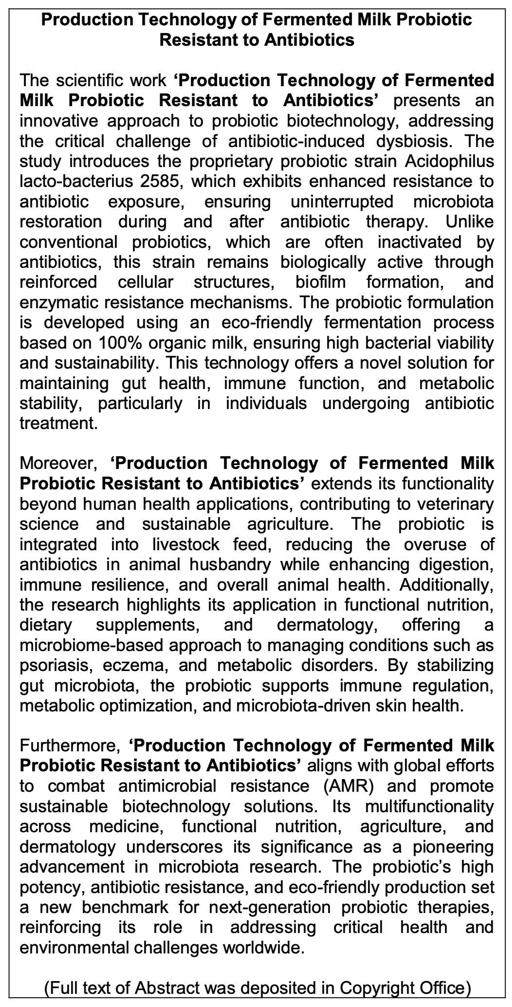 Work of Science: ‘Production Technology of Fermented Milk Probiotic Resistant to Anthibiotics’