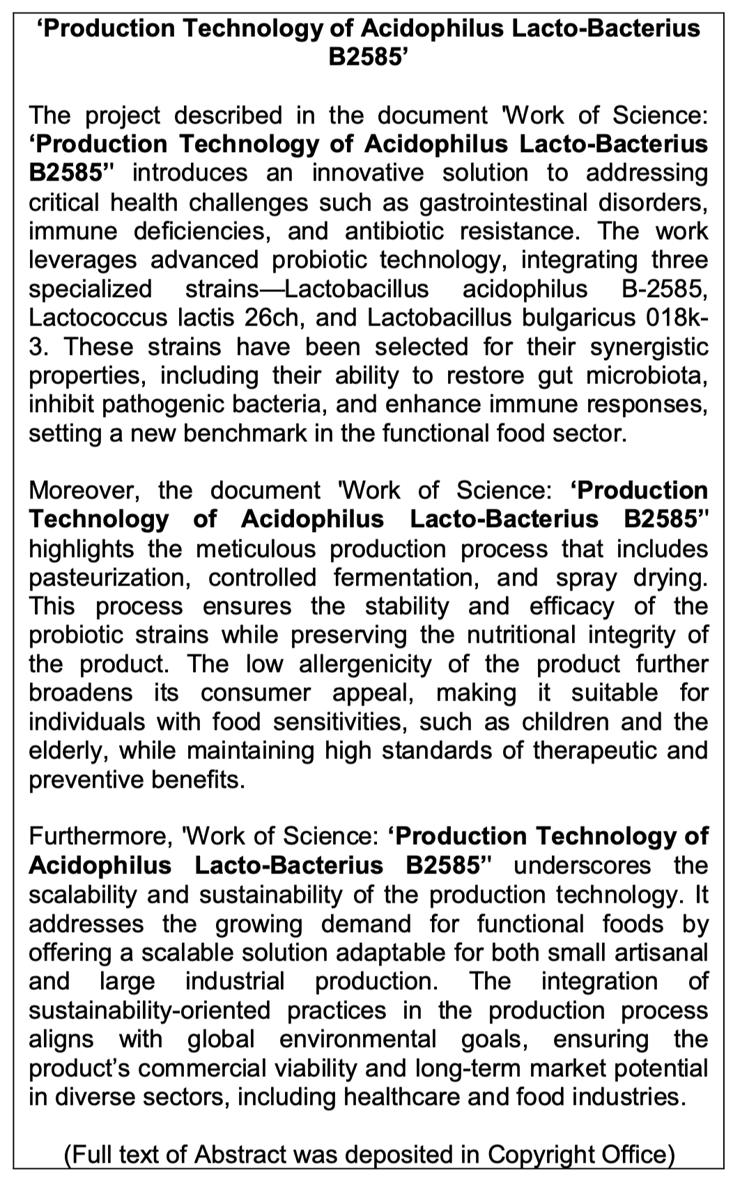 Work of Science: ‘Production Technology of Acidophilus Lacto-Bacterius B2585’