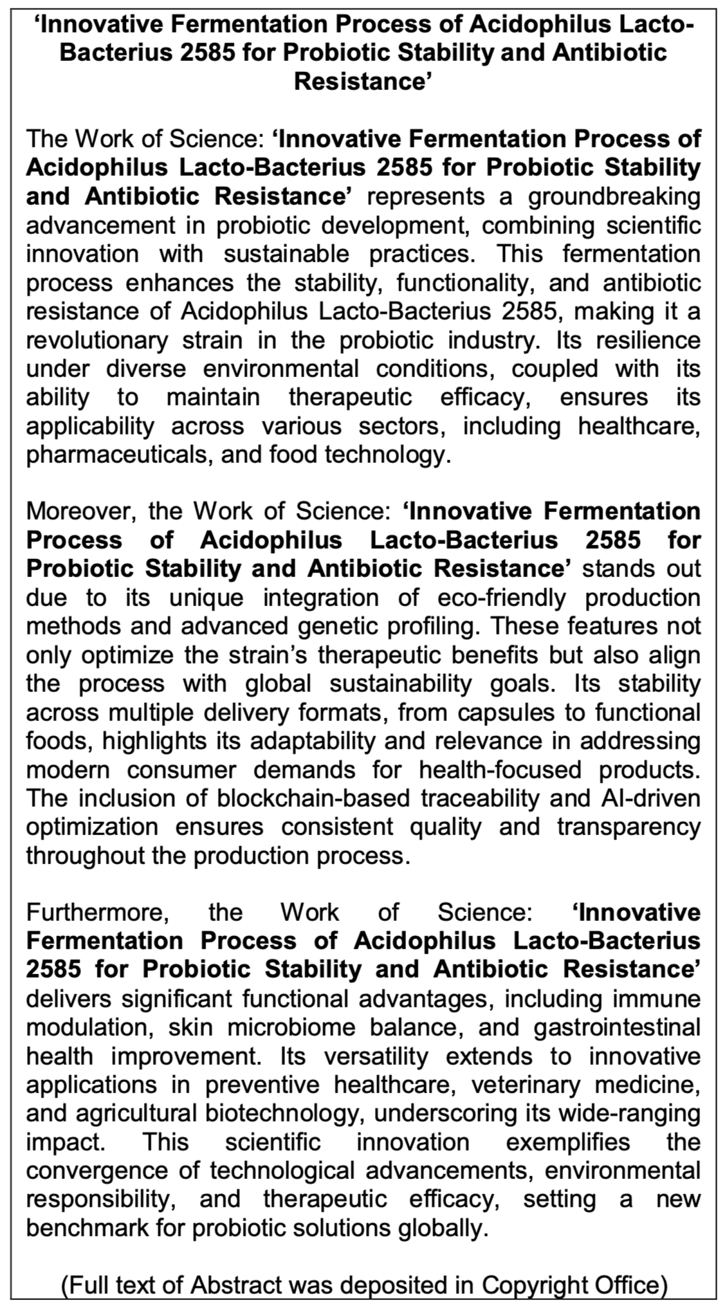 Work of Science: ‘Innovative Fermentation Process of Acidophilus Lacto-Bacterius 2585 for Probiotic Stability and Antibiotic Resistance’