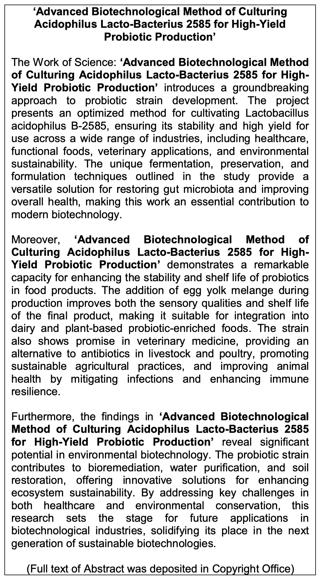 Work of Science: ‘Advanced Biotechnological Method of Culturing Acidophilus Lacto-Bacterius 2585 for High-Yield Probiotic Production’