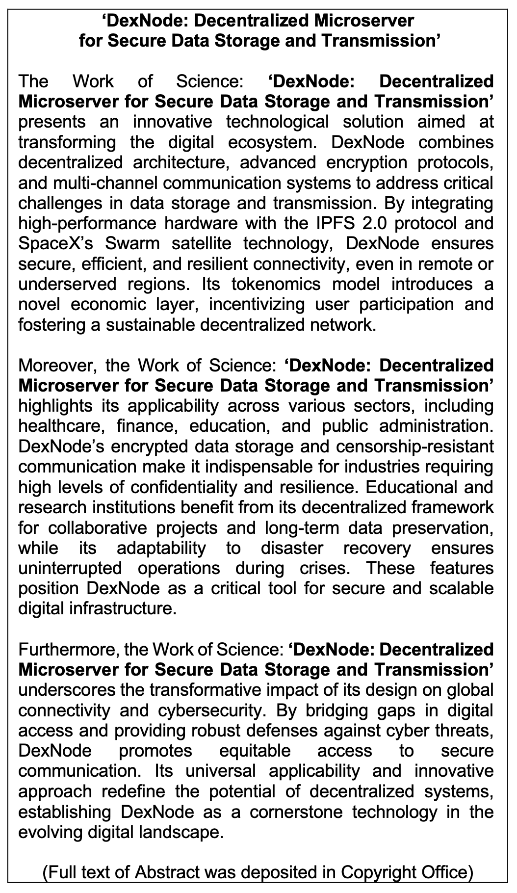 Work of Science: 'DexNode: Decentralized Microserver for Secure Data Storage and Transmission'