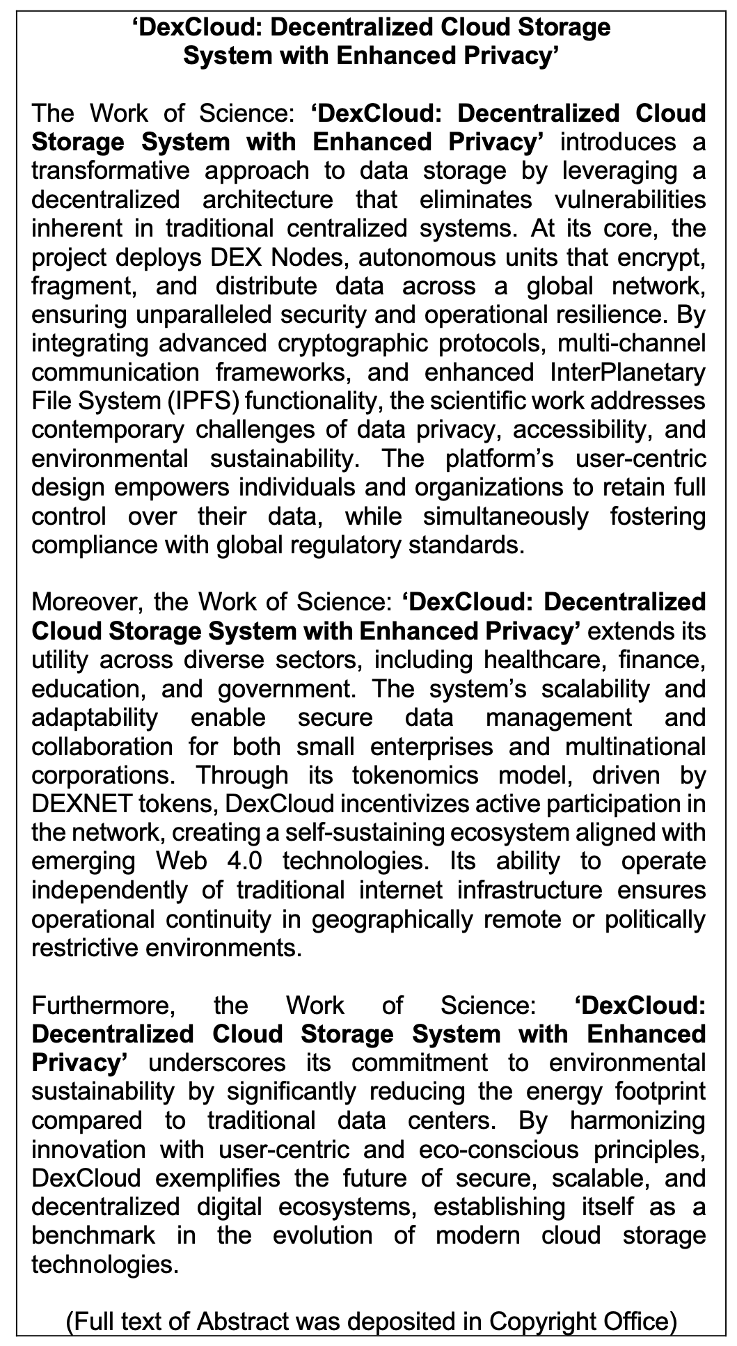 Work of Science: 'DexCloud: Decentralized Cloud Storage System with Enhanced Privacy'