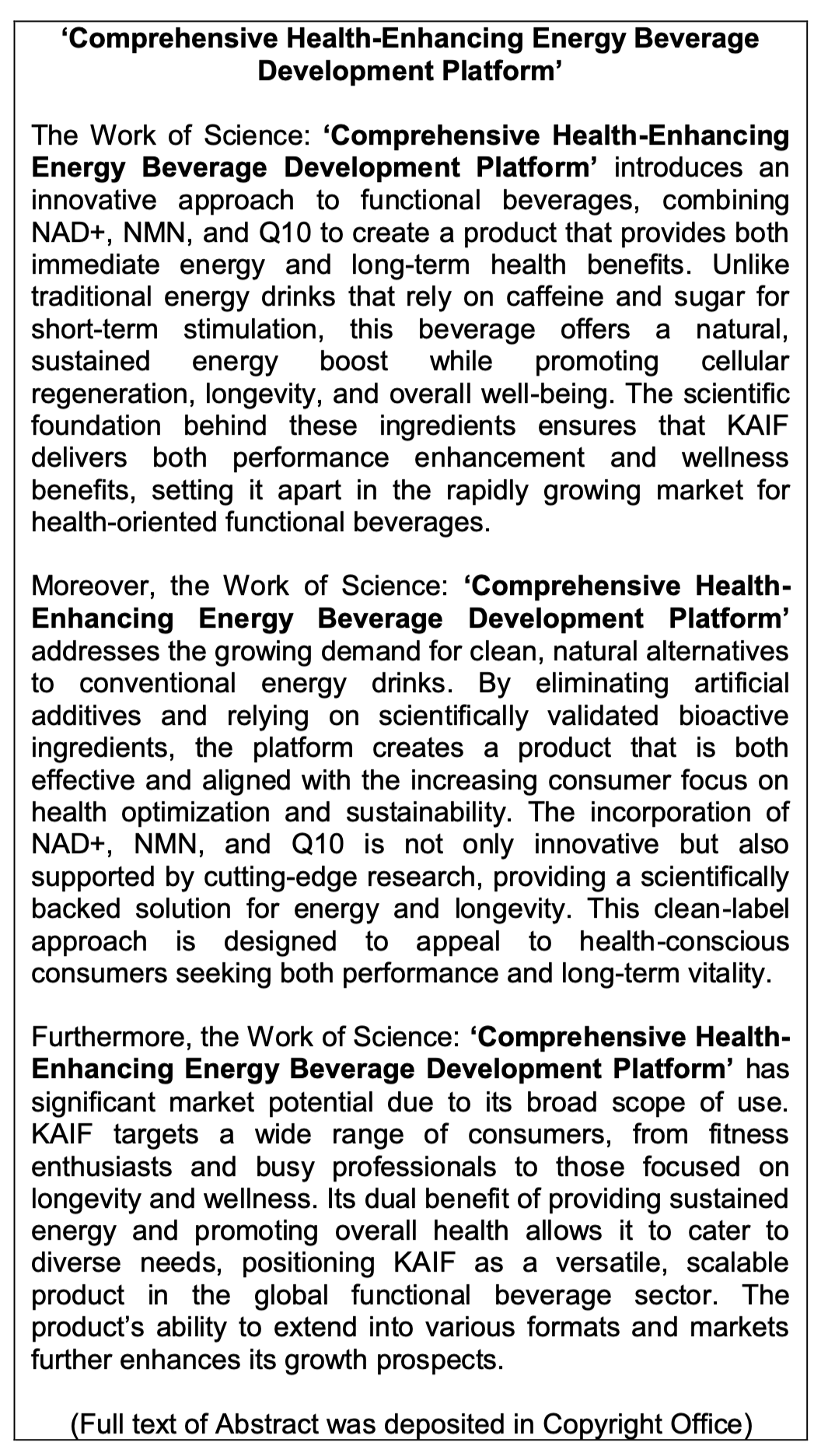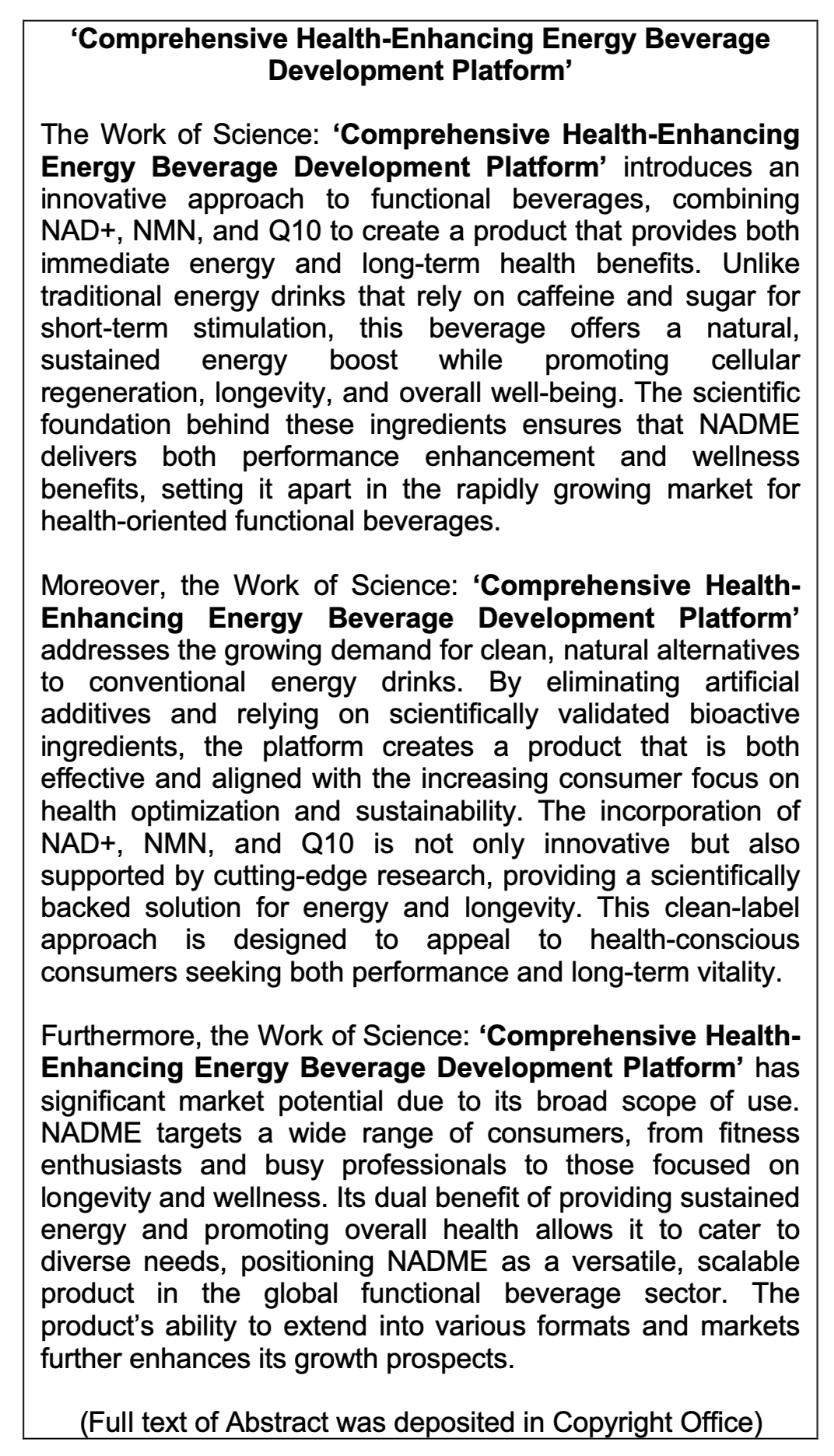 Work of Science: 'Sustainable Energy-Boosting Beverage with Long-Term Health Benefits and NAD+ and NADH Stabilization System'