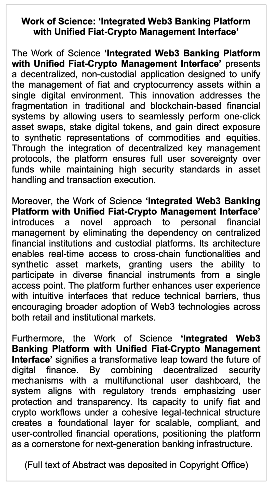 Work of Science: ‘Integrated Web3 Banking Platform with Unified Fiat-Crypto Management Interface’