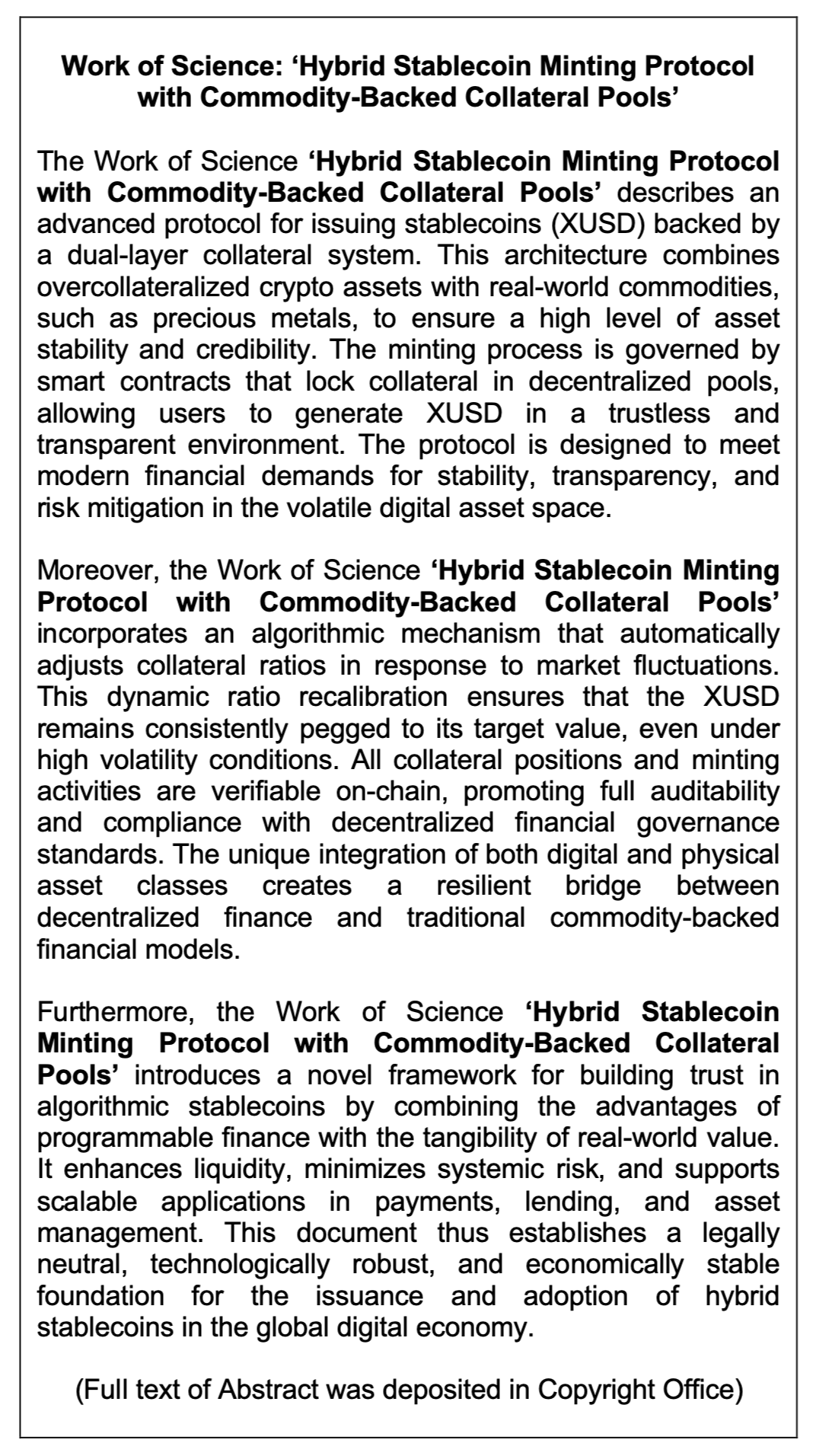 Work of Science: ‘Hybrid Stablecoin Minting Protocol with Commodity-Backed Collateral Pools’