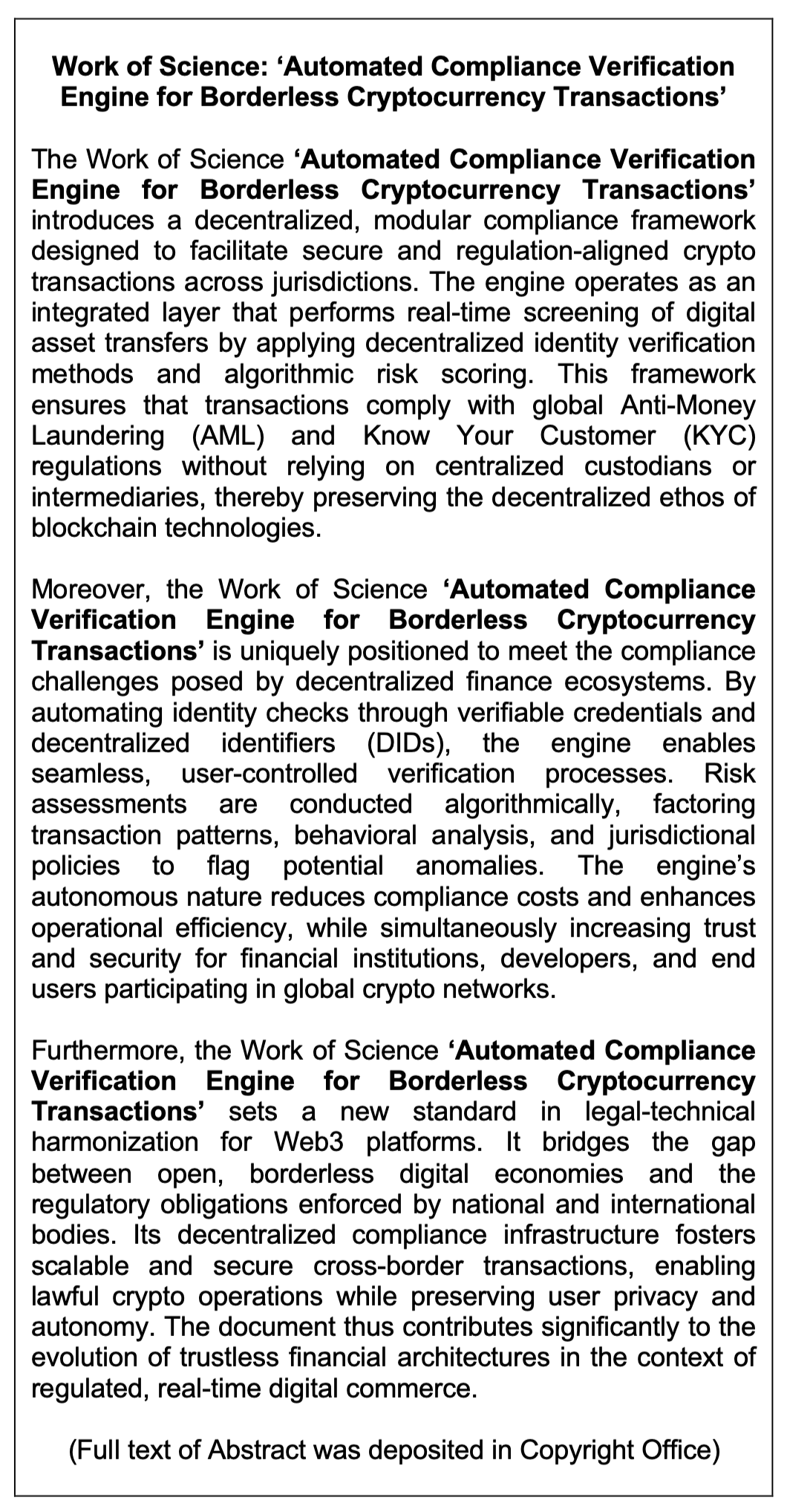 Work of Science: ‘Automated Compliance Verification Engine for Borderless Cryptocurrency Transactions’