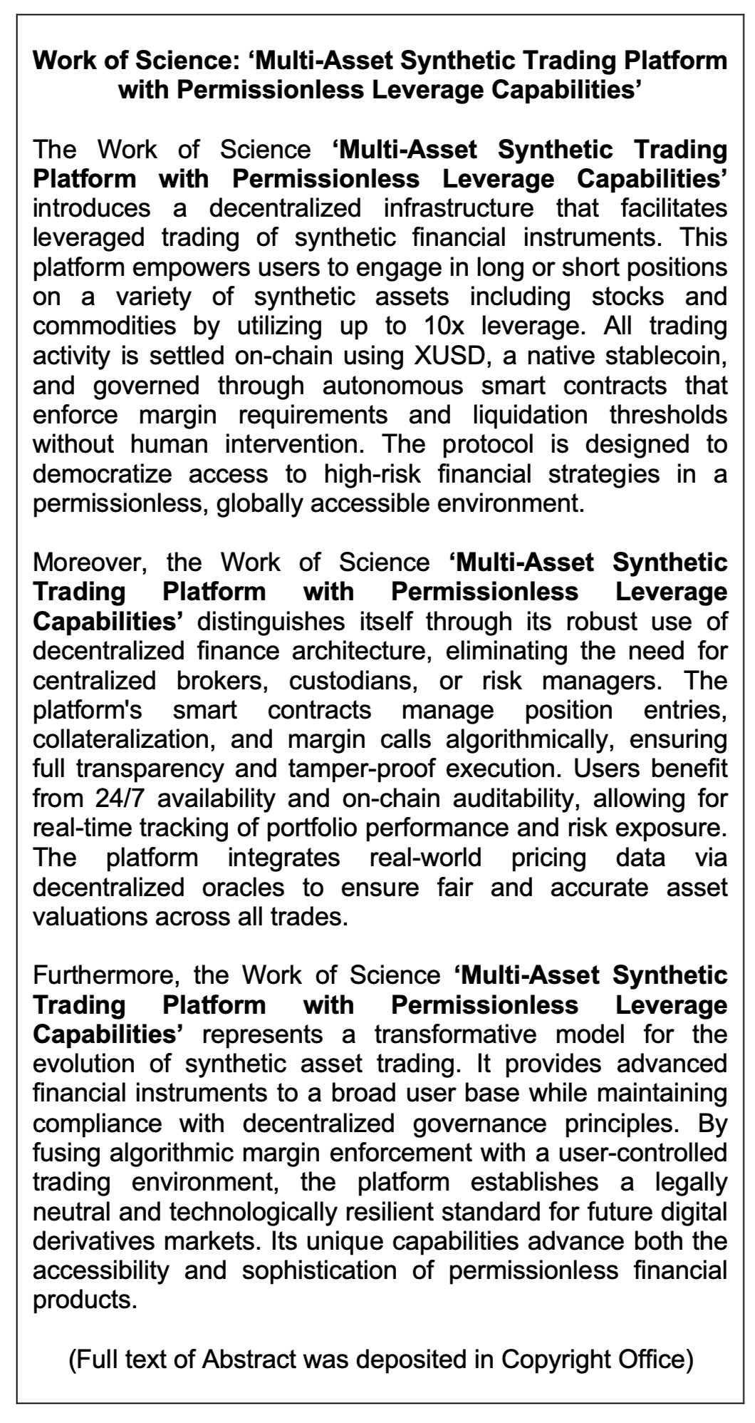 Work of Science: ‘Multi-Asset Synthetic Trading Platform with Permissionless Leverage Capabilities’