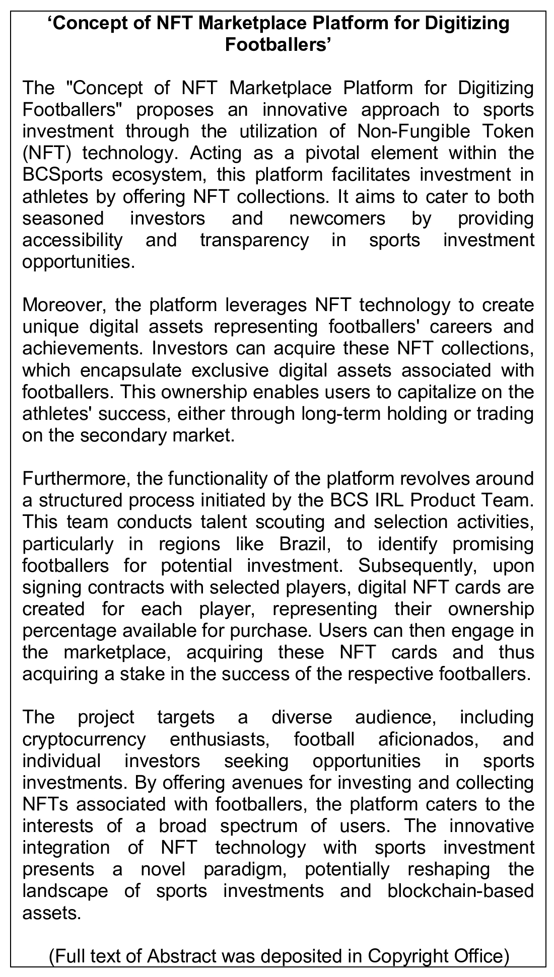 Work of Science: 'Concept of NFT Marketplace Platform for Digitizing Footballers'