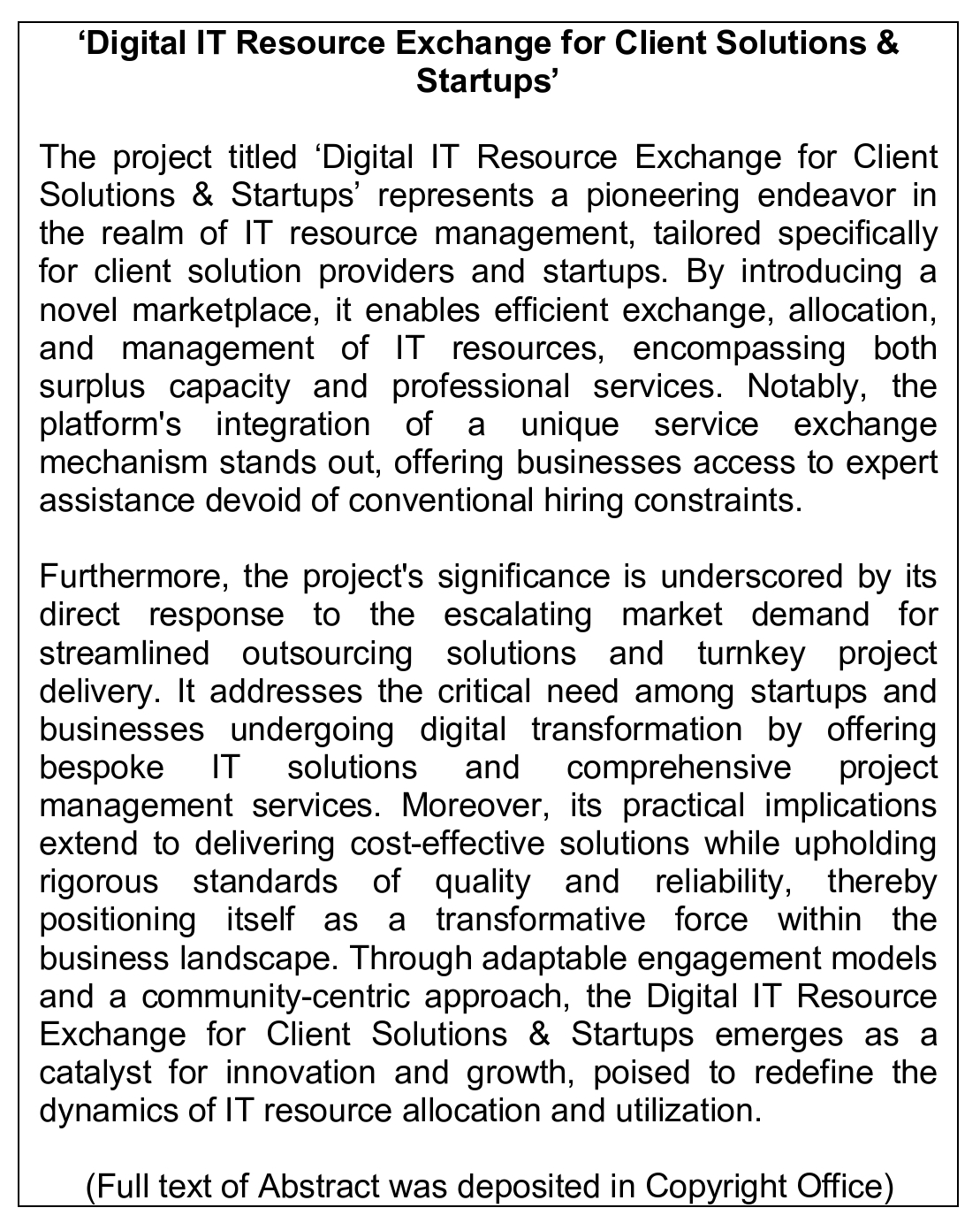 Work of Science: 'Digital IT Resource Exchange for Client Solutions & Startups'