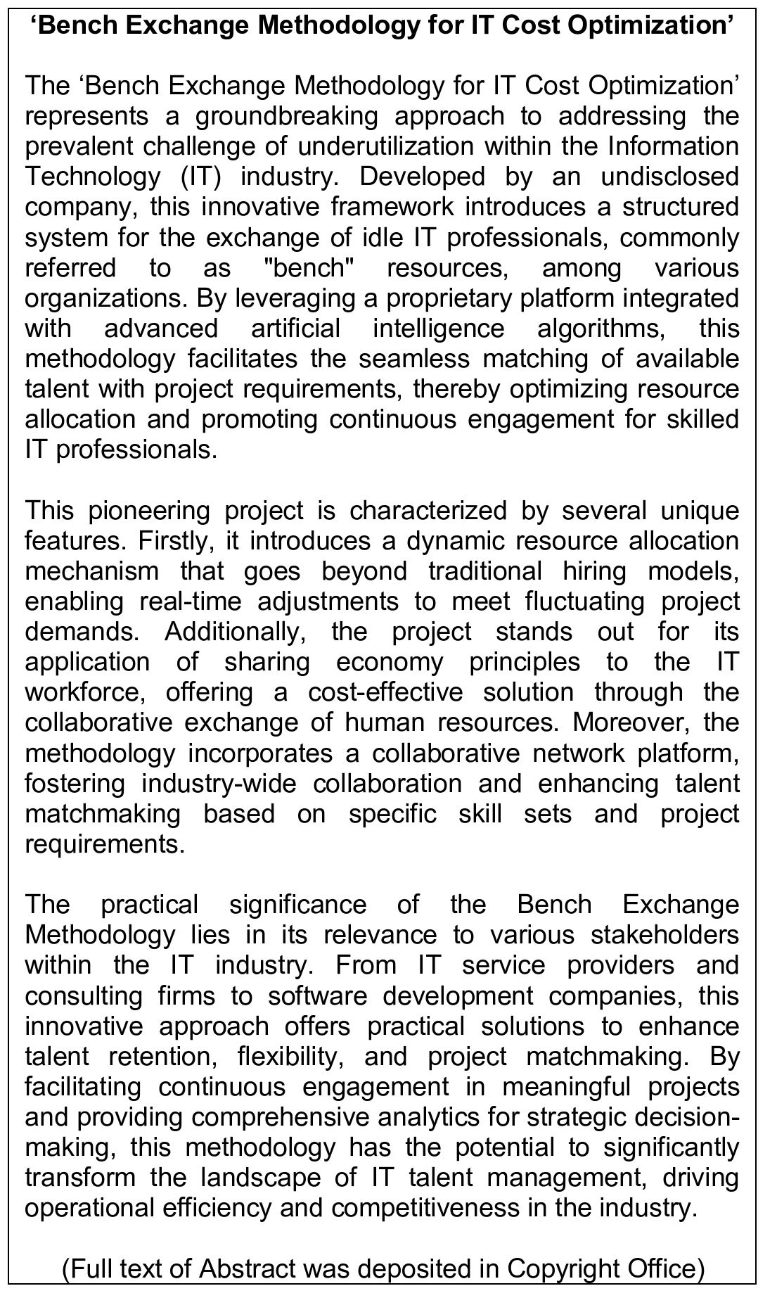 Work of Science: 'Bench Exchange Methodology for IT Cost Optimization'