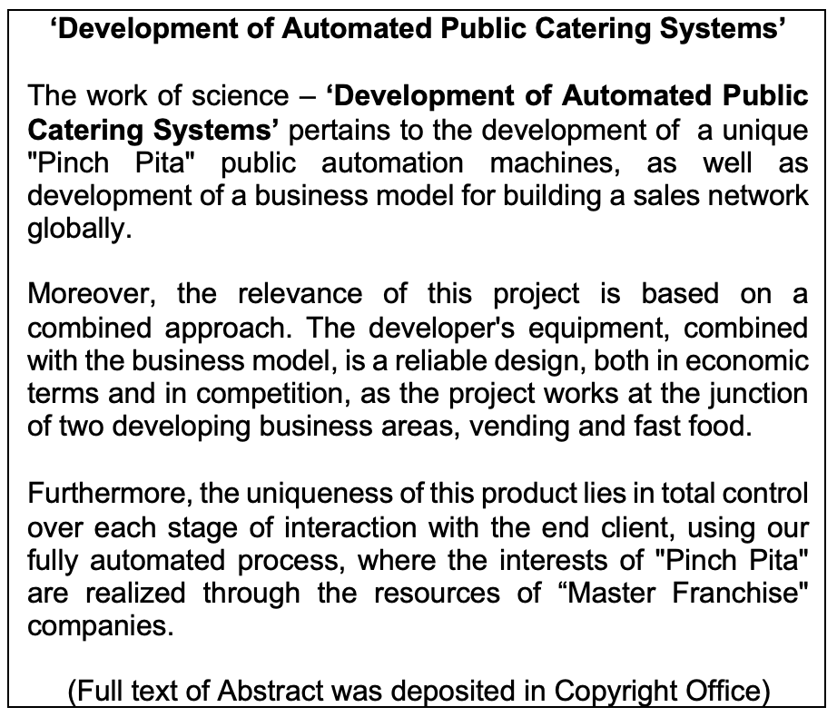 Work of Science: 'Production and Implementation of Proprietary Catering Systems, Based on Authorship Management Model'