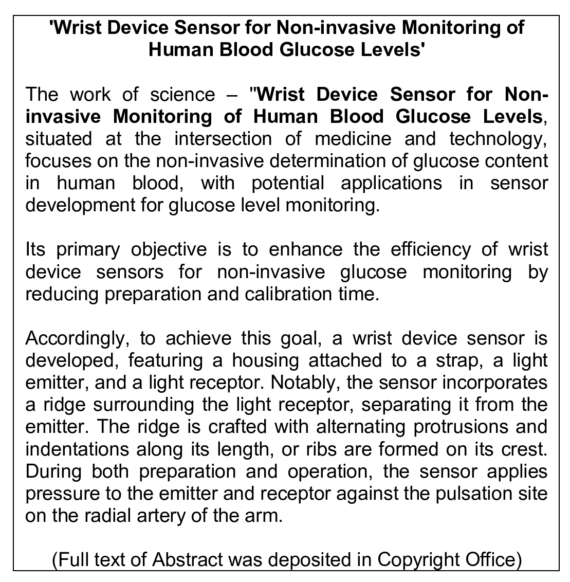 Work of Science: ‘Wrist Device Sensor for Non-Invasive Monitoring of Human Blood Glucose Levels’
