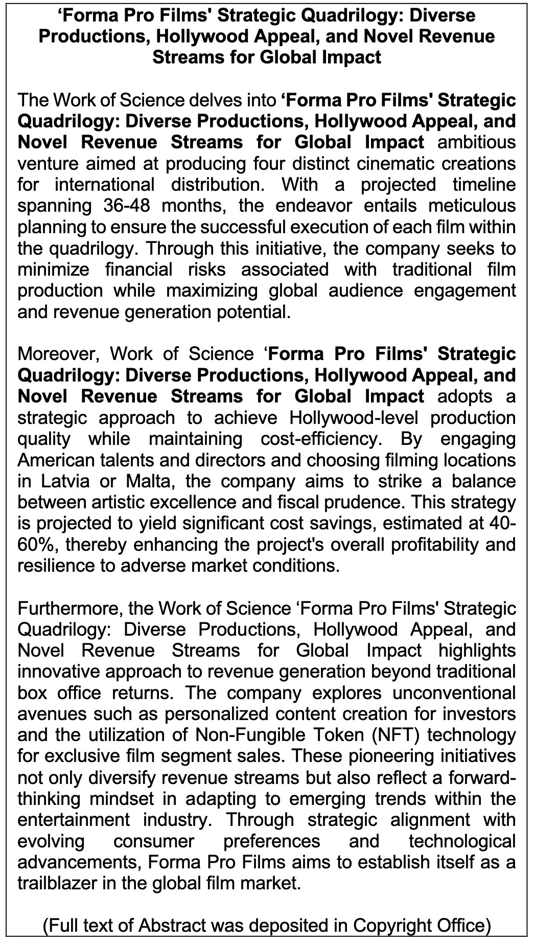 Work of Science: ‘Forma Pro Films' Strategic Quadrilogy: Diverse Productions, Hollywood Appeal, and Novel Revenue Streams for Global Impact