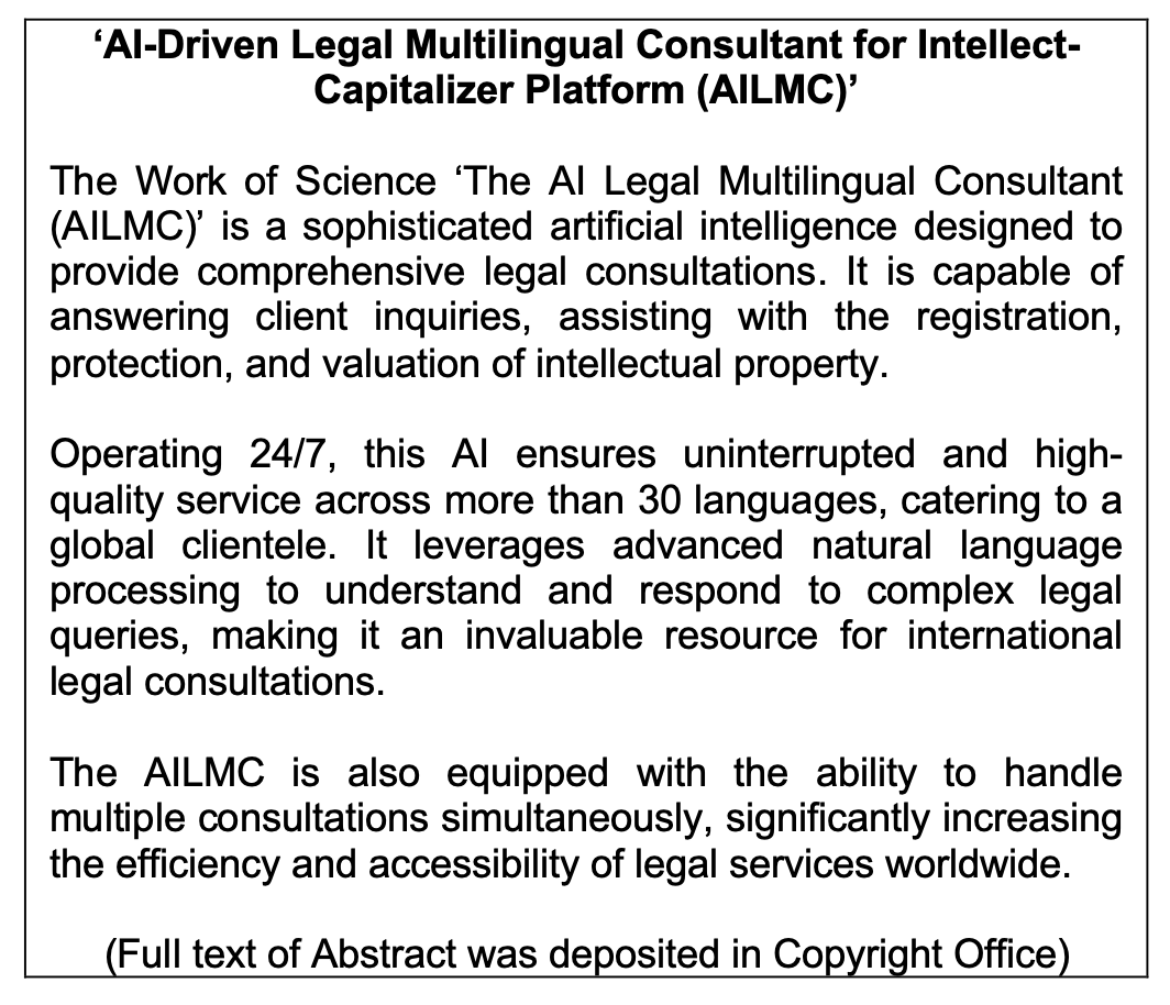 Work of Science: 'Al-Driven Legal Multilingual Consultant for Intellect-Capitalizer Platform (AILMC)'