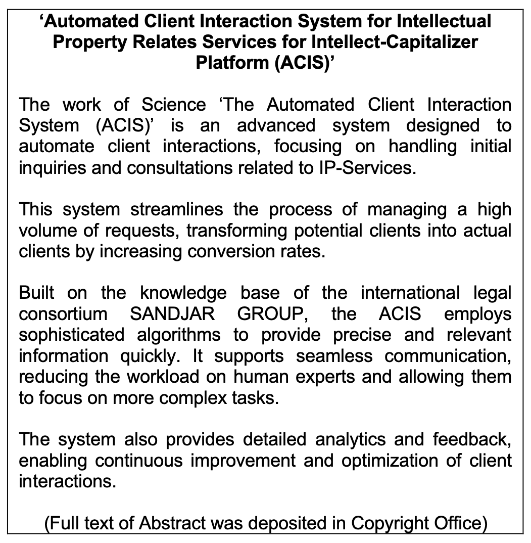 Work of Science: 'Automated Client Interaction System for Intellectual Property Relates Services for Intellect-Capitalizer Platform (ACIS)'