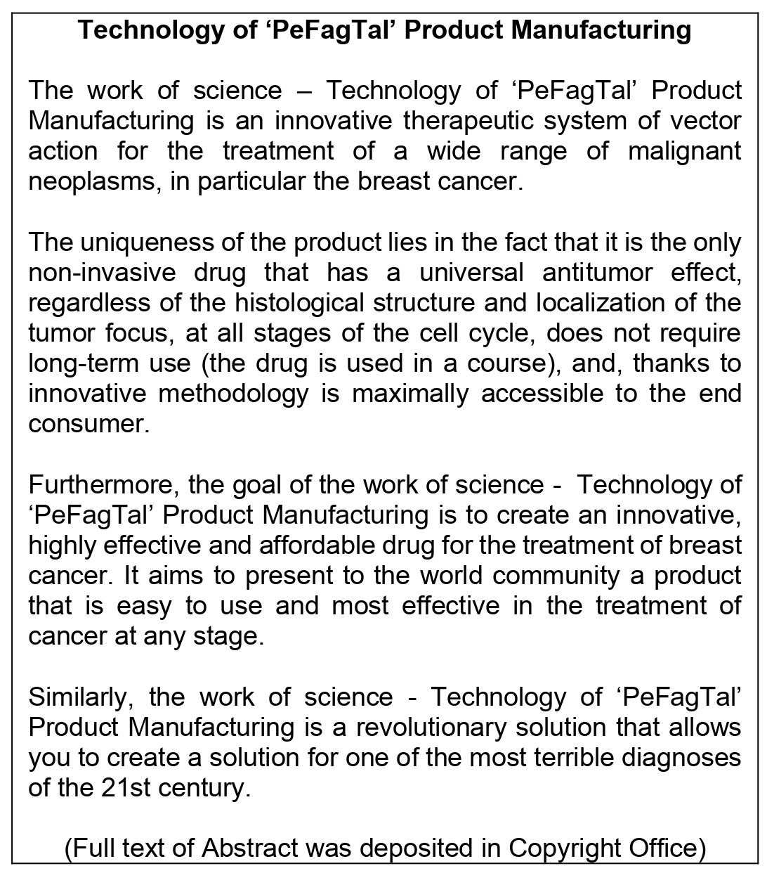 Work of Science: Technology of 'PeFagTal' Product manufacturing