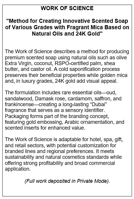 Work of Science: "Method for Creating Innovative Scented Soap of Various Grades with Fragrant Mica Based on Natural Oils and 24K Gold"
