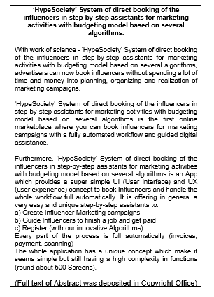 | Title of Work | ‘HypeSociety’ System of direct booking of the influencers in step-by-step assistants for marketing activities with budgeting model based on several algorithms | ||