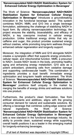 | Title of Work | 'Nanoencapsulated NAD+/NADH Stabilization System for Enhanced Cellular Energy Optimization in Beverages' | ||